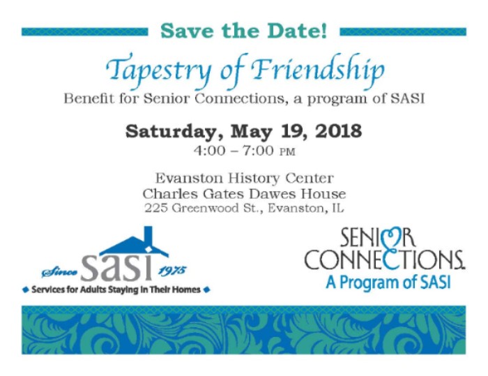 Save the Date and mark your calendar now for The Tapestry of Friendship, spring fundraiser, Saturday May 19, 2023 from 4:00 pm - 7:00 pm. Once again this event will benefit Senior Connections, a program of SASI. The event will be at the historic Charles Gates Dawes House, 225 Greenwood St, Evanston, IL. Be sure to join us for an afternoon of refreshments, drawings for unique prizes and live auction. We aren't taking reservations just yet but tickets will be $75.00, $25.00 for students.